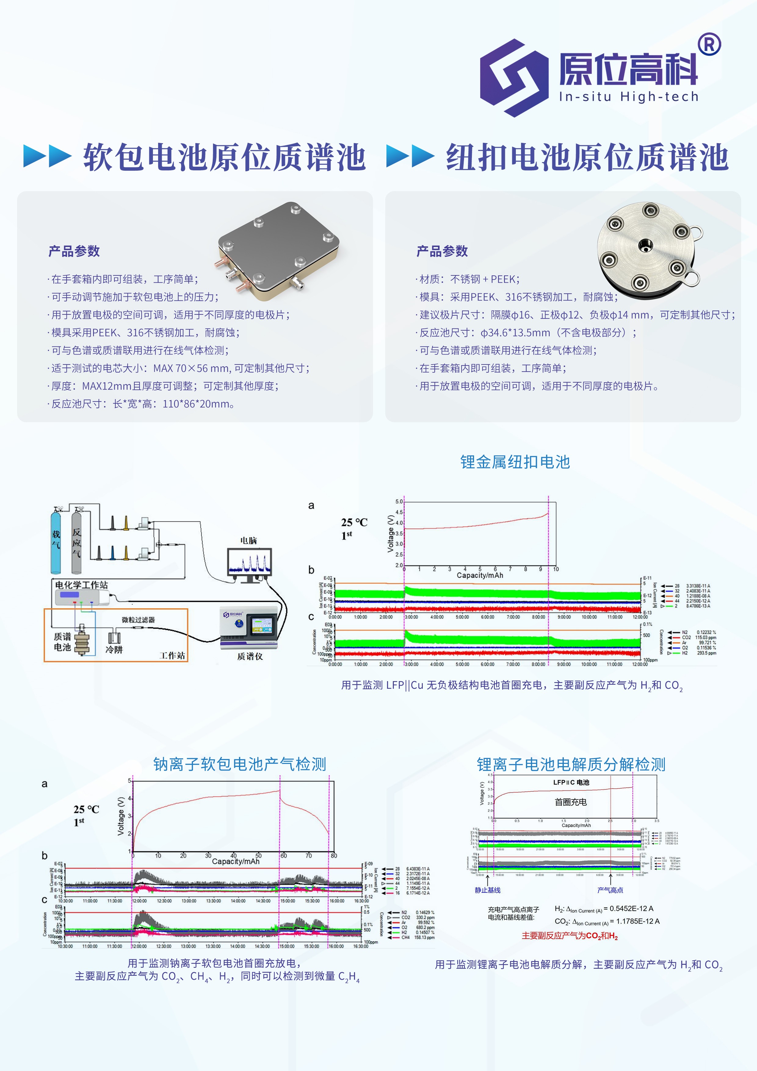 公司现有原位表征系统解决方案(含测试)、焦耳加热装置、催化剂评价装置及电池制备平台四大主营产品体系,可满足客户研发、小试、中试不同阶段的多样化需求。公司拥有各类技术人员近百人,建有四个实验室及一个干房。实验室配有红外光谱仪、拉曼光谱仪、X射线衍射仪、电化学微分质谱、电化学工作站、气相色谱、枝晶显微镜、充放电测试仪等多种分析仪器及全套电池制备设备。